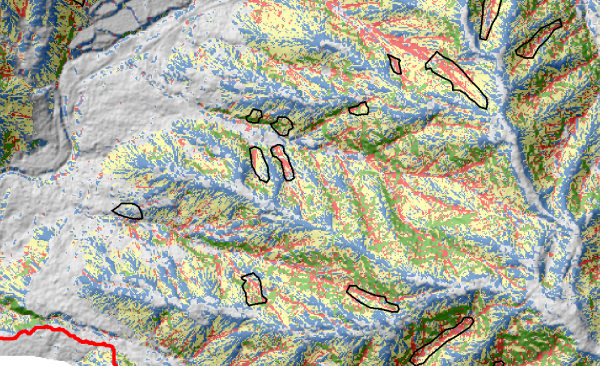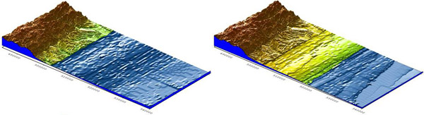 | LEMsを現実地形に応用した例:初期地形(左)→21万年後の地形?(右) | |