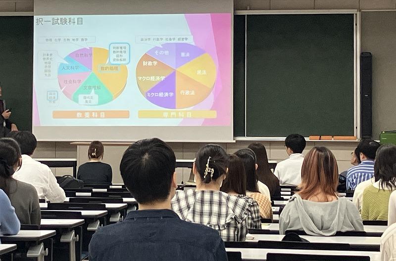 公務員といってもその職種は多岐にわたりますが、ガイダンスでは仕事の全体像から試験スケジュールの概要まで、初めて公務員を意識する学生にも分かりやすく解説が行われました。3日間で100名以上の新入生に参加いただき、参加者からは説明終了後に「今から準備できることは何か」「大学生活と試験勉強の両立について」といった活発な質問も見受けられました。入学したばかりの初々しさの中にも、自らの将来を真剣に見据えようとする熱意が感じられ、これからの4年間での成長と変化が非常に楽しみになるひとときでした。