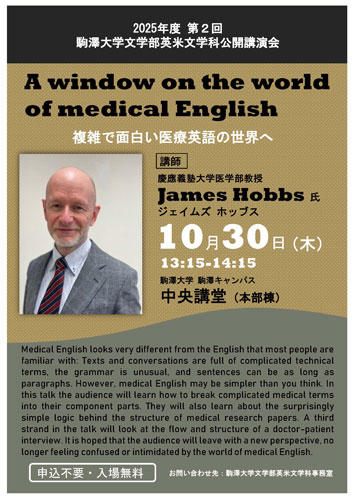 令和7年度 駒澤大学英米文学科主催 第2回公開講演会のお知らせ | |