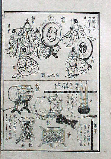 樂器(かくき)を調(とヽの)ヘ/調ヘ‖樂器ヲ|樂器ハ音楽の器笙(せう)篳篥(ひちりき)太鼓(たいこ)の類を云。楽妓(かくき)と書たる本もあり。楽妓とハ舞姫(まひひめ)の事也。是ハ誤(あやま)りにて楽器と書たるを是(ぜ)とす。〔72オ三〜四〕