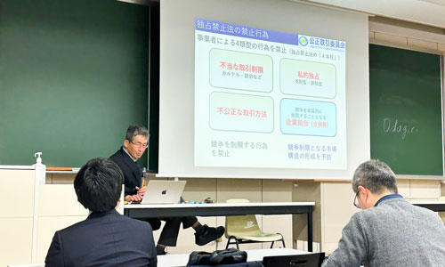 経済学部の授業にて公正取引委員会による「独占禁止法教室」が開催されました1月8日(木)、経済学部の専門科目「ゲーム理論b(担当:経済学部現代応用経済学科 岡室 博之 教授)」の最終講義の時間を利用し、公正取引委員会主催の「独占禁止法教室」が開催されました。 本講座は、将来の経済活動を担う学生たちが独占禁止法の意義と役割を深く理解し、社会人として法を遵守するとともに、消費者として確かな視点を持つことを目的として全国各地の大学で実施されているものです。 当日は、公正取引委…