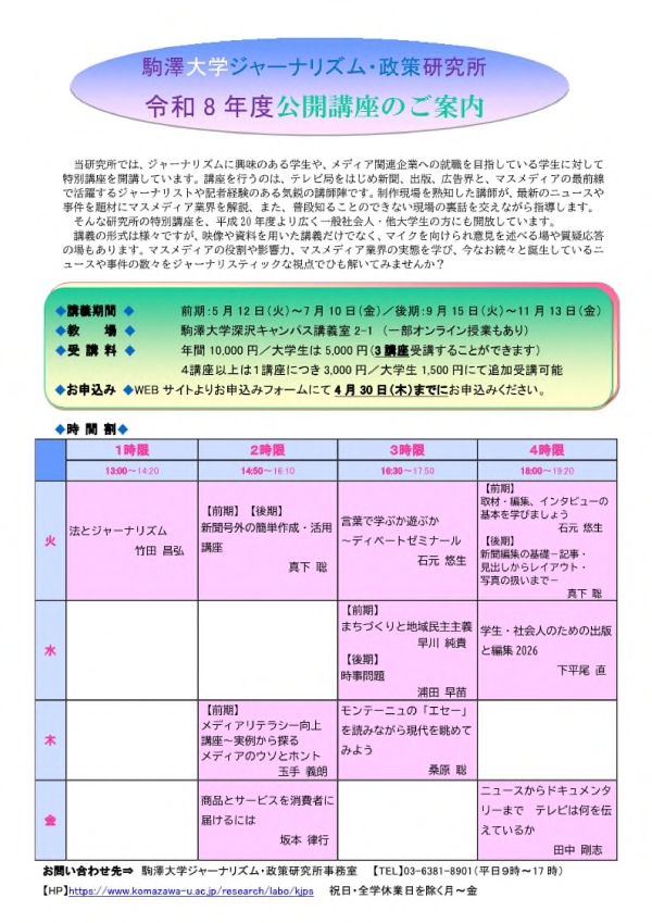 The Komazawa University Institute for Journalism and Policy Studies (KJPS) is a research institute that conducts comprehensive research on journalism and policy and provides special guidance to students who wish to pursue related fields. We look forward to your participation.