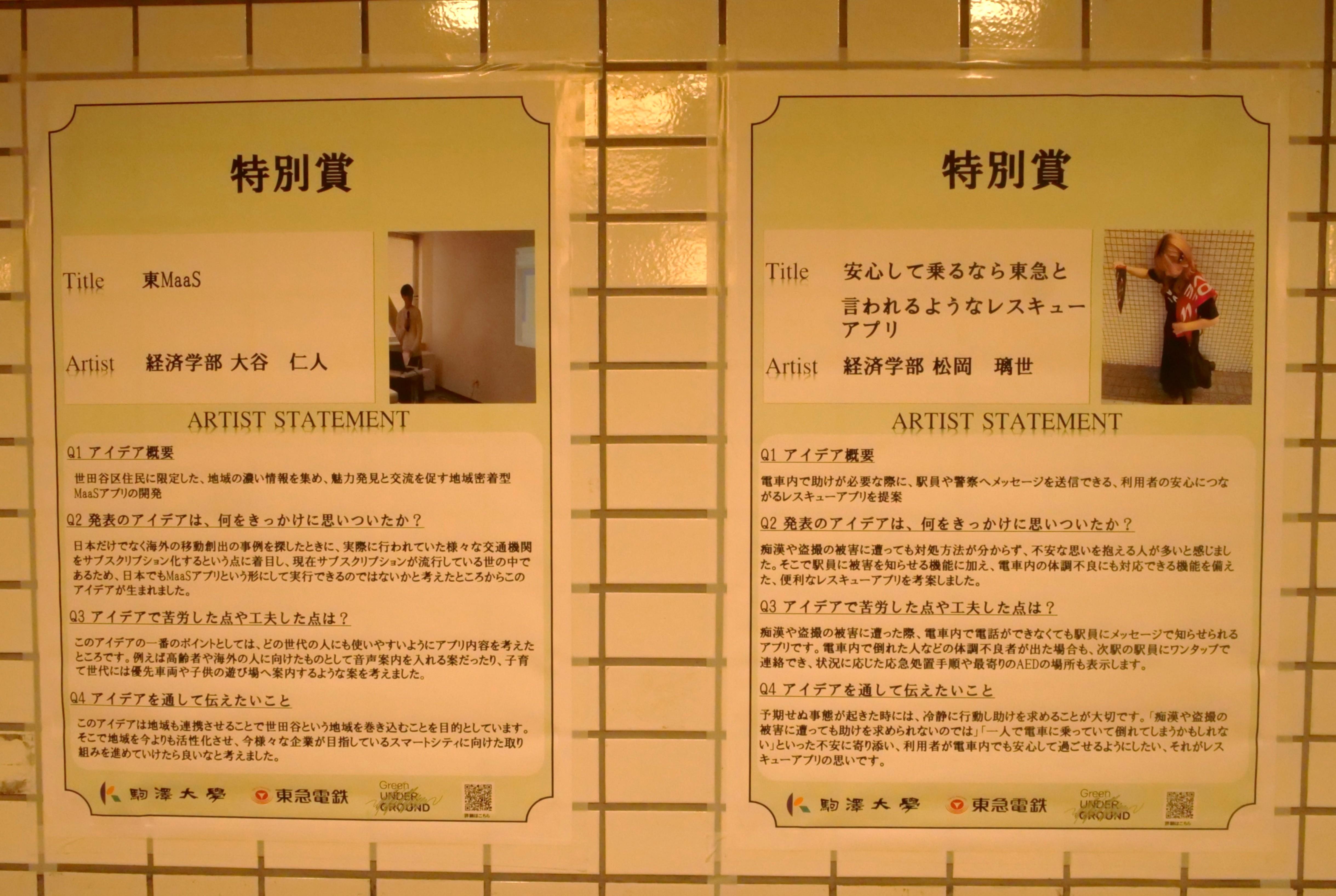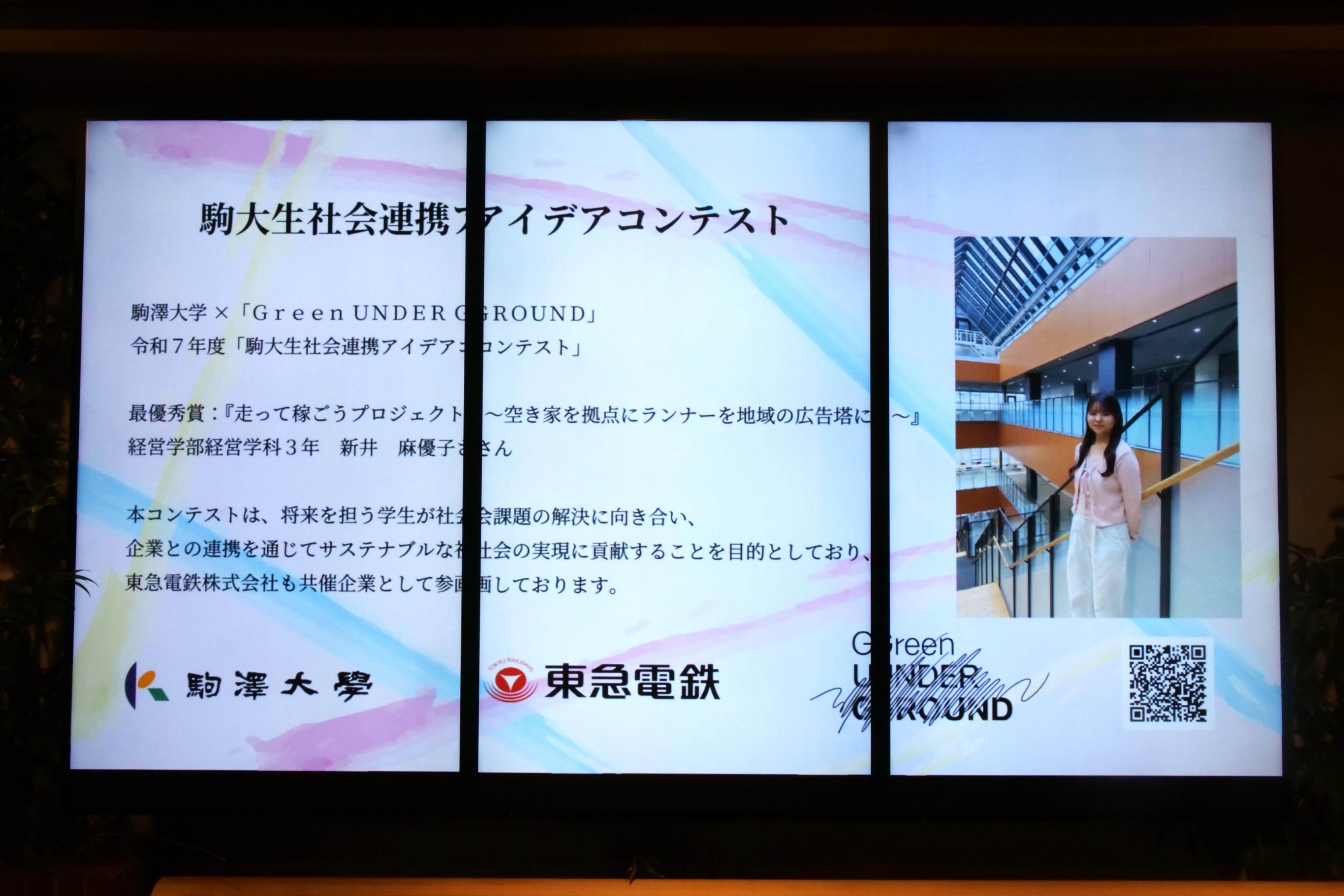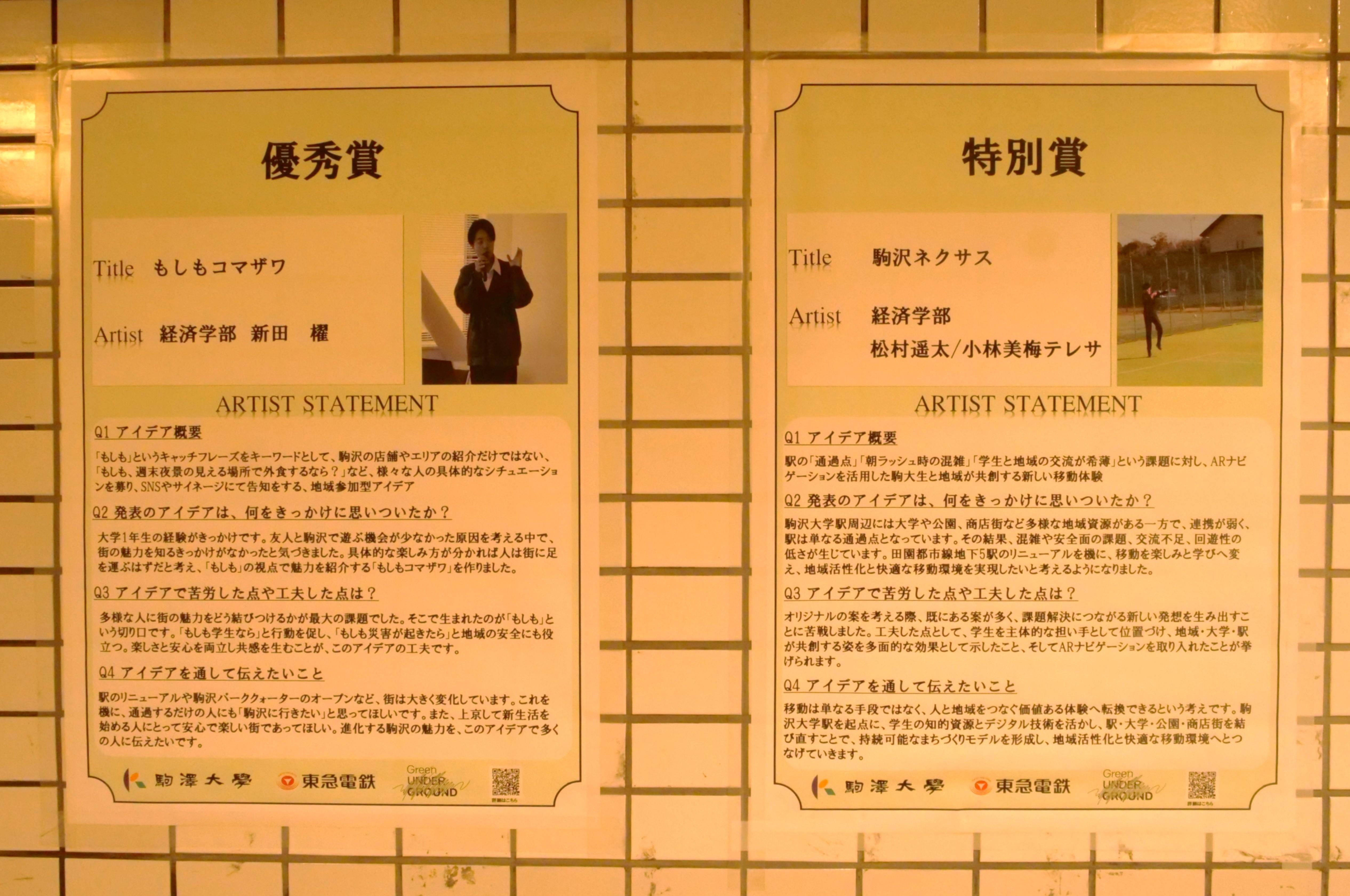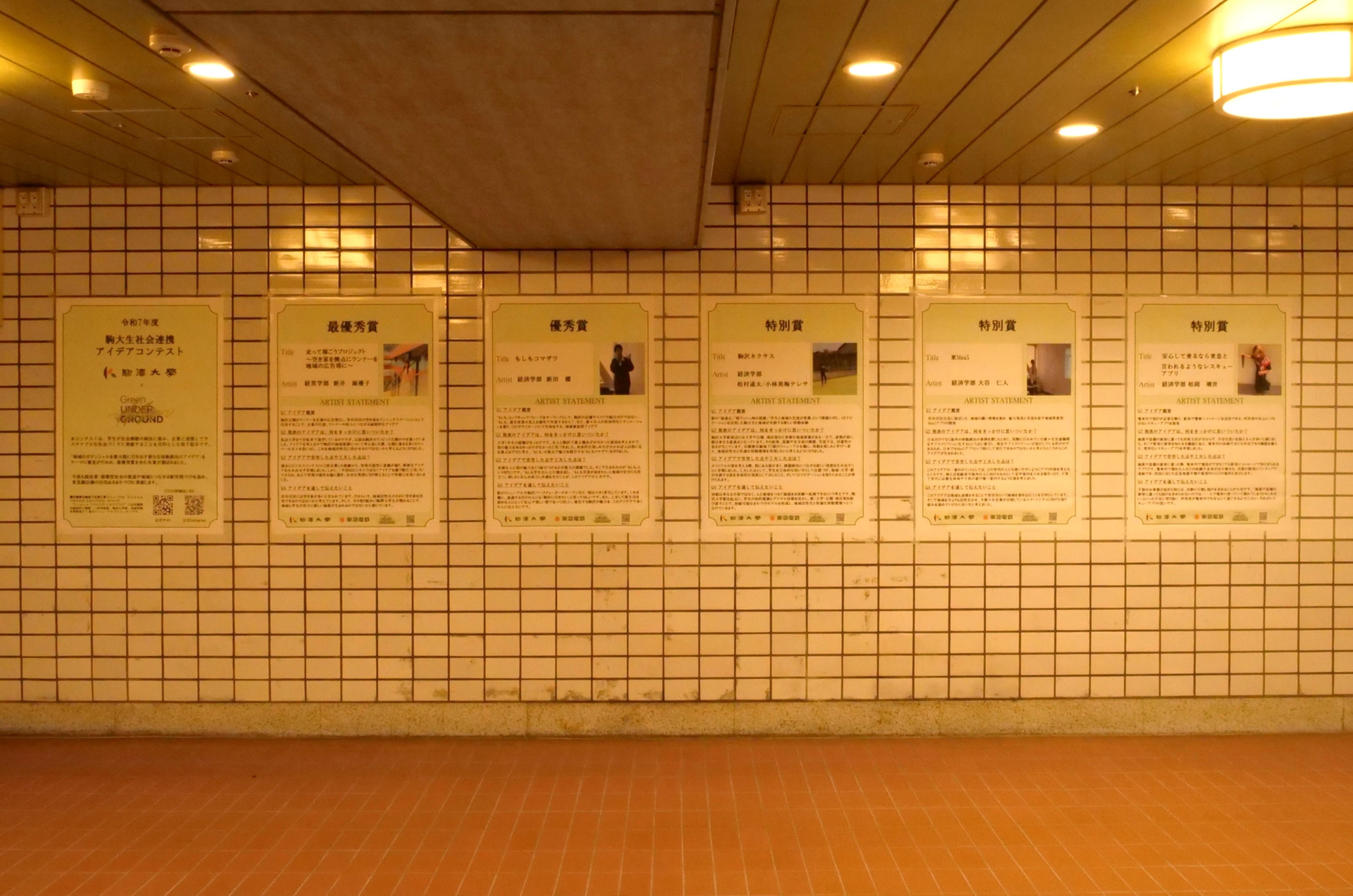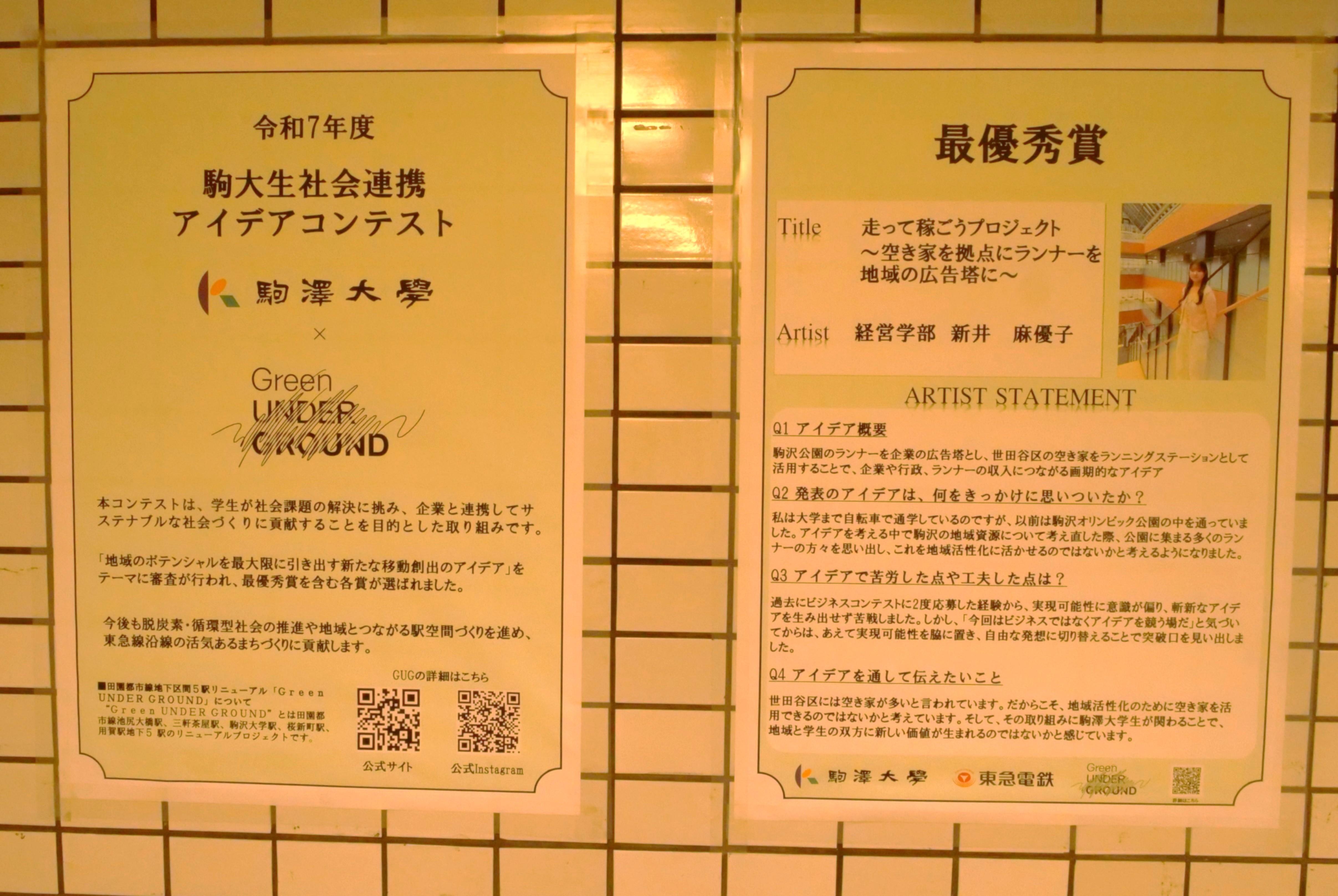 令和7年度「駒大生社会連携アイデアコンテスト」の副賞として、共催企業の東急電鉄株式会社の協力により、駒沢大学駅デジタルサイネージ「GUG PLATFORM」において最優秀賞に選ばれたアイデアの紹介映像が放映され、改札内コンコースには、各受賞作品の主旨をまとめたB1サイズのポスターが掲示されています。