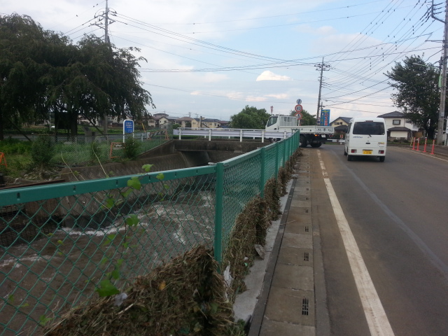 | K老人福祉センター不老荘前。右岸フェンスに漂流物が残っている。(南入曽) |