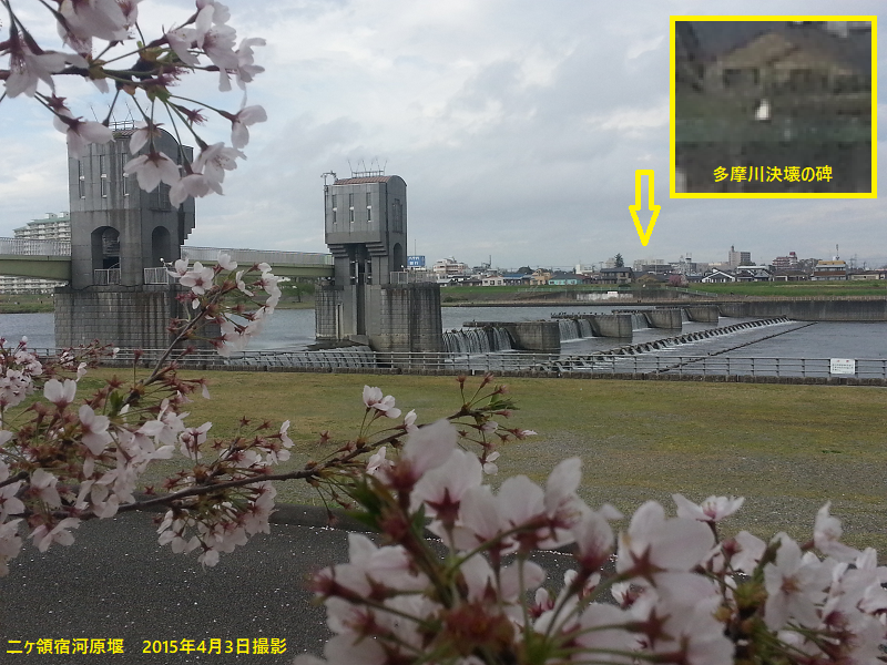 大雨により多摩川の増水が想定された場合は、一時的に撤去されるようです(2019年履修しん撮影)。狛江市職員6人で運んでいたようですが、あまりに重たいので、2014年に軽いステンレス製になったようです。2023年の伝承碑はこちら(2023年履修あおきくん撮影)。Google衛星写真(狛江側に多摩川決壊の碑、川崎側に二ヶ領せせらぎ館があります。対岸(川崎側)の桜がいい。 |