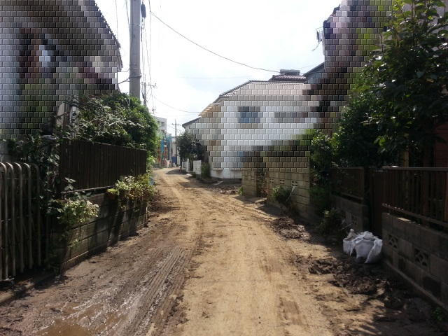 | 多摩川決壊の碑(東京都狛江市) 写真は和泉多摩川駅近くにある多摩川決壊の碑である。この地は1974年8月31日に接近した台風により小堤防が決壊し、水害に見舞われた。この水害時は全国にリアルタイムで報道がされるほど被害が大きかったという。二ヶ領宿河原堰が影響で迂回流という流れが発生したのが原因とされており、災害の直後に堰を爆破する事で流れを変えた。この災害は流された住宅の住人から裁判を起こされており、結果国が敗訴し損害賠償を行い「人災」であると決定づけられた。(りゅうた) 川に家が流されていく様子をテレビで見て衝撃を受けたのを覚えています(NHKアーカイブス)。多摩川左岸は旧河道であり(地理院地図)、用水の取水のために、江戸時代に堰が作られたので、水害の危険が想定される地域であったようです。 |