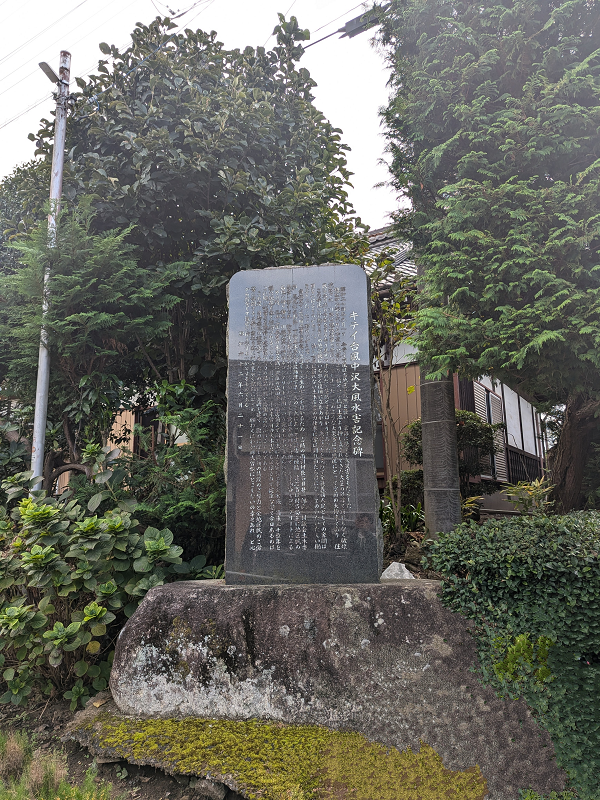 キティ台風 中沢大風水害記念碑 (茨城県桜川市) 茨城県桜川市大曽根にある水害災害伝承碑である。この水害災害伝承碑は1949年に関東地方を襲ったキティ台風の物である。キティ台風とは、前々年カスリーン台風や前年のアイオン台風によって大きな被害を受けた関東地方を襲った台風であり死者行方不明者160人を出した。この桜川市大曽根では、写真に写っている中沢川が氾濫し濁流が大曽根地区を襲った。ただの用水路に見えるが、ここにかかっていた全ての橋を押し流してしまい、道と川の境目がわからなくなるほどになってしまったという。現在ではしっかりと川が整備されており、そのような危機が怒る可能性は低くなっていると思われるがゼロでは無いのは確かであるため、しっかりと刻まれた先人達からの記録を生かすべきである。 (nettu) |
