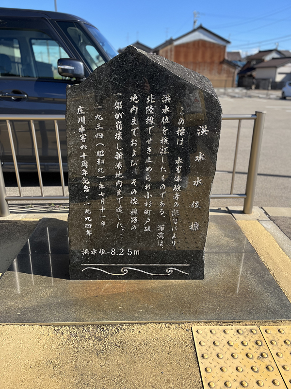 洪水水位標 (富山県射水市) 写真は,富山県射水市越中大門駅南にある水害伝承碑である。この水害伝承碑は,昭和9年7月に発生した,庄川の洪水についての伝承碑であり,その被害の大きさは,射水郡の大半が浸水し,死者は20人,負傷者240人,流失家屋94棟,民家破損5,418棟,浸水家屋4,009棟,田3,986ha,畑182haが冠水した。原因として考えられることは,7月10日夜半よりの降雨は,庄川上流岐阜県山岳地帯において未曽有の豪雨となり,11日には庄川の最高水位13.10m,最大流量3,361m^3/sを記録し、浅井村(現射水市)にて堤防決壊し,ここまでの被害を出した。被害に関しては,北陸本線も被害にあい,交通や運輸において多大な損失があったと考えられる。 今の庄川の流路と決壊した場所を地理院地図で確認すると,流路の変化はさほど見られず,決壊した場所や被害にあった場所は,水田や住宅が広がっていることが見て取ることができた。住宅が立地しているということは,人口増加による住む場所の増加によるものだと考えられ,根拠としては色別標高図で確認しても,標高的に高くないし,自然堤防上でもないことから考えられる。この水害伝承碑が住宅,駅の近くにあるということは,水害と隣り合わせであることを忘れずに過ごしたい。(OS) |