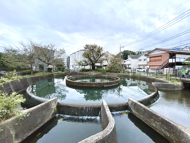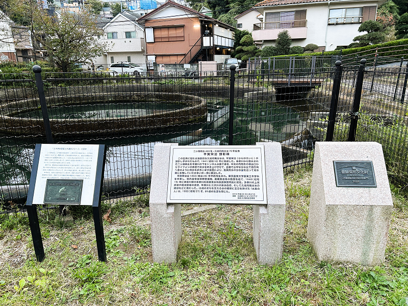 | 二ヶ領用水久地円筒分水(川崎市高津区) これは神奈川県川崎市高津区にある、二ヶ領用水久地円筒分水というものである。 二ヶ領用水(写真)は、川崎市のほぼ全域を流れる人工用水であり、慶長2(1597)年に小泉次大夫が完成させた。久地で4本の堀に分水されていたが、流量や水位の変化の影響で、正確な分水は難しかった。また、流域の水田の拡大とともに水不足が深刻となり、用水をめぐる水騒動が頻発するようになった。 そこで昭和16(1941)年、平賀栄治によって直径16mの円筒分水が造られた。平賀は、平瀬川が多摩川へ流れるように流路を変更し、平瀬川と二ヶ領用水の交差地点で、二ヶ領用水を平瀬川の下に通した。それがサイフォンの原理によって再び噴き上がることを利用したものが円筒分水である。円周をそれぞれの灌漑面積に合わせた比率の長さで仕切ることにより、一定の比率で分水できるようになった。(SH) 説明板写真こちら 溝の口駅北口・円筒広場(キラリデッキプレート写真、イルミネーション写真) ※SH撮影 参考資料:川崎市教育委員会「二ヶ領円筒分水」 ちなみに、群馬県高崎市にも「長野堰円筒分水」があります。二ヶ領用水は、久地円筒分水の少し上流側で、平瀬川を「伏せ越し」で交差しています。二ヶ領用水は多摩川に堰を造り、宿河原から取水しています。その宿河原堰の狛江側でかつて氾濫が発生しました。 地理院地図 |