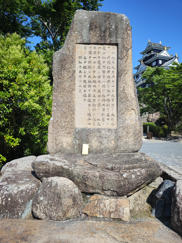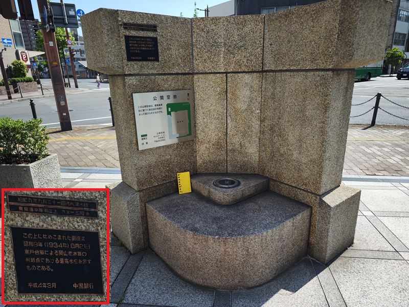 室戸台風伝承碑 (岡山市北区) 6月の上旬に地理学科の田中靖先生のゼミで広島県を巡検した際の帰りに、個人的な興味で岡山県の自然災害伝承碑を巡りました。中国地方の大都市と言えば広島でしょうが,中国と四国を結んでいるのは岡山でありますし,山陰と山陽を結ぶ幹線も通っています。そのような岡山市を,昭和9年(1934年)の9月に室戸台風が襲いました。今回巡った自然災害伝承碑の面白いところは,岡山城を背後に納めた石碑以外は、その地点の浸水深さを示しており、設置主体も異なることです。地銀や,学校法人など行政とは異なる組織が設置しています。GISの技能があれば,自然災害伝承碑の示している浸水深で簡易的な浸水実績図を作成することが可能であると思われます。岡山市内にコンパクトに分布しており,主に徒歩で,半日程度で回ることができました。市電を駆使すればより容易にめぐっていけると思われます。 (↙下に続く) |