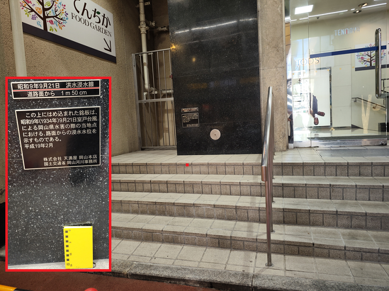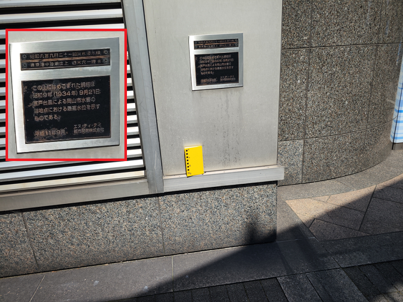 今日においては、護岸や上流でのダム建設などの治水により今の岡山市内は守られています。しかしながら,現地の伝承碑を前に自分の体と比べ,どれほどまでの浸水深があったかを比較することができます。過去の災害を身近に感じることができ、これが自然災害伝承碑のあるべき姿の一つだと感じました。西日本は,地質的に花崗岩質な地域が多く、降水量も多いことから土砂災害に見舞われることが多です。今後も,自然災害伝承碑が整備され、地域防災や防災教育の一助となることを考えていきたい。 (たちばな) 岡山城周辺の災害伝承碑など(たちばな撮影) KMLファイル NTTクレド岡山 天満屋岡山本店入口 中国銀行前 岡山城石垣標識 就実学園 写真の撮り方がうまい!野帳を置くところが地理学徒風ですね。周辺も探索している点もすばらしい。地理の教科書では「瀬戸内式気候は雨が少ない」と教わり、溜池なども多いけれど、水害が無縁ではないことを意識する必要がありますね。 (全国Q地図・今昔マップ) |