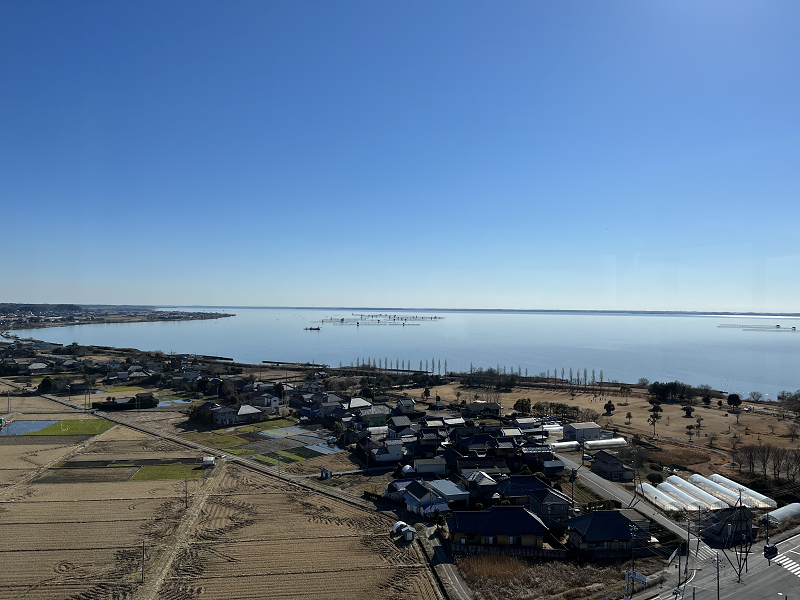 湖岸道路沿いに説明板があるようでした(ストリートヴュ-)。湖があふれる時の水位の上昇は急ではないものの、それでも犠牲者が出ているのは、湖岸低地が広くて逃げられなかったのかもしれません。虹の塔からの写真。20年以上前に霞ヶ浦大橋を渡った記憶がありますが、有料だった気がします。(地理院地図) |