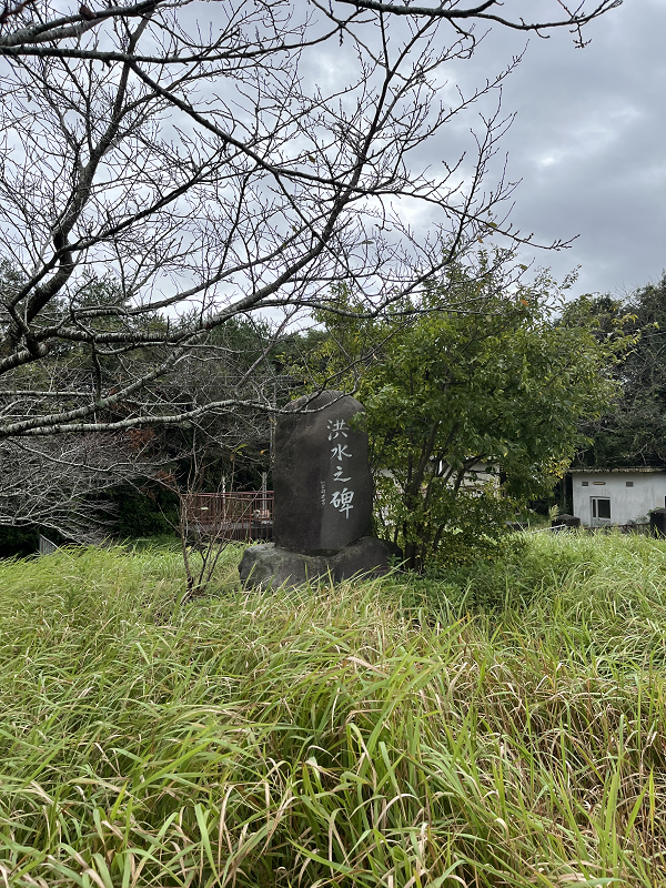 洪水の碑 (茨城県行方市) 水害伝承碑として選んだ写真は、茨城県行方市霞ケ浦大橋付近にある「洪水之碑」である。霞ケ浦は1938年6月から7月にかけて台風の影響を受けた前線による大雨が原因で水位が上昇して洪水が発生した。この災害は「内水型洪水」と呼ばれるタイプで、流域で降った雨が霞ケ浦から流出しにくいことが洪水に繋がった。被害は最大約Y.P3mにまで湖水位が上昇して、浸水面積は約3万haであった。死者45人、床上・床下浸水81、739戸で、冠水被害は数十日にも及んだ。 現場に足を運んで感じたことは、この碑を見つけるのが大変なことである。地理院地図の自然災害伝承碑に記載はされているが、実際は写真からもわかるように草や木々に覆われている。そのためあまり管理されていないような印象を持った。水害伝承碑は過去の水害を後世に伝えていくものなので、管理をして水害の認知を高めていくべきだと考えた。 (田沢) |