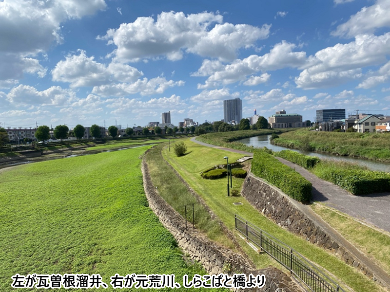 瓦曽根溜井 防水記念碑 (埼玉県越谷市) この防水記念碑は、地域住民とほかの地域から駆けつけた人々が協力して越水を防いだことによって、被害を抑えることができたことを記念して作られた碑である。 1890(明治23)年8月下旬、上旬からの多雨と前日の悪天により、埼玉県羽生付近で利根川の堤防が決壊した。決壊によって流れ出た水は、川や水路を伝って決壊地点から40㎞下流に位置する越谷にも届いた。低地が広がる越谷市域では大洪水に見舞われたほか、元荒川沿いにつくられた瓦曽根溜井でも水位が上昇し、越水のおそれがあった。しかし、地域住民と溜井の下流にすむ東京の人々が昼夜を問わず土俵を積んだことで、越水を防ぐことに成功した。 (T.T.) (写真)しらこばと橋より |
