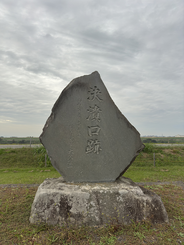 決潰口跡碑 (埼玉県加須市) これは埼玉県加須市のカスリーン公園で撮影したカスリーン台風による堤防決壊跡の碑だ。カスリーン台風は1947年9月に日本に接近し関東地方や東北地方に甚大な被害をもたらした台風だ。死者・行方不明者合わせて約2000人にもなり、利根川と荒川で複数個所の堤防が決壊したため特に埼玉県と東京都で大洪水が起こり甚大な被害がもたらされた。写真の場所は9月16日の午前0時20分ごろに350mにわたり堤防が決壊をし大洪水の発端となった。この場所は江戸時代に人口的に開削された直線河道で、明治43年の大水害の際には被害はなく、浸水などのリスクは低いと考えられ比較的楽観視されていた場所だった。しかし当時とは状況が異なっており、実際は利根川の水はすべてここに集中することになっており渡良瀬川との合流点や下流にある鉄橋の影響で水位が上がるなど増水時には水の流れが悪くなるといった構造的な問題を抱えていた。 (よしけん) |
