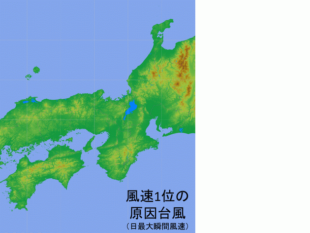 岐阜 | 44.2m/s | 伊勢湾台風 | 台風9807号 | 第2室戸台風 | 関空台風 | 室戸台風 |