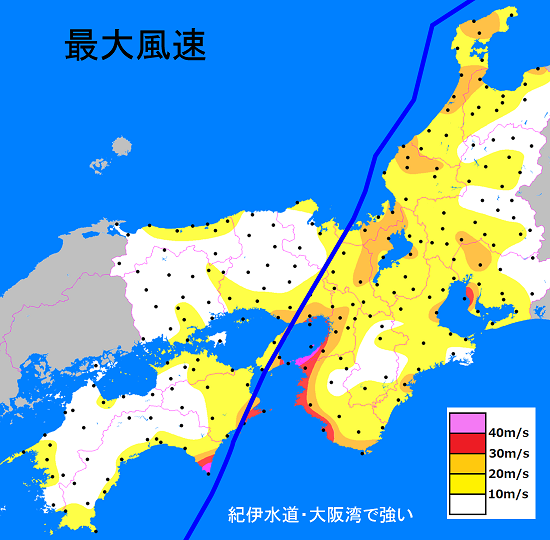 図中にマウスを持っていくと「最大瞬間風速」に変わります。 風速は空気の動いた速さを示したもの。 最大風速は10分間平均風速で最大のもの。 最大瞬間風速は、瞬間的な風速で最大のもの。 紀伊水道や大阪湾を中心に暴風が吹き荒れた。 琵琶湖沿岸や伊勢湾にも暴風を観測したエリアがある。 (風速データは気象庁による)。 ※気象庁アメダス観測値を参照 |