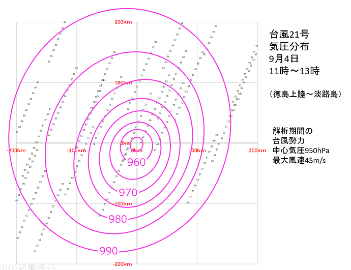 気象官署の気圧データから、台風の気圧分布を図にしたもの。 四国から近畿に近づく段階での10分間隔のデータから、台風中心との位置関係を考慮して、 時間別データを空間に置き換えて表現している。 ほぼ同心円状となっているが、台風の経路方向(北北東~南南西)に低圧部分が広い。 また、南東側の方が等圧線間隔がやや狭い(気圧の傾きが大きい)。 気圧の傾きが大きいほど風が強い傾向がある。なお、台風の地上風は反時計回りに吹き込む。 ※気象庁気象官署観測値より独自に作画 |
