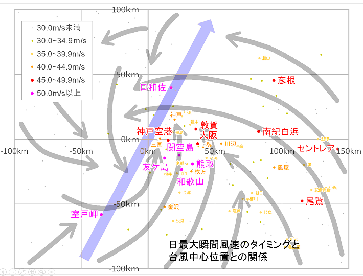 図にマウスをのせると風速値により彩色されます。 もっとも強い風が吹いた時に、台風の中心からどの方向にどれだけ離れていたか、を示した図。 記録的な防雨風は、台風の東側を中心に観測されていることがわかる。 東側では中心から100km以上離れたところでも、45m/s以上の暴風のところがある。 なお、台風の西側では、記録的な暴風となった地点はない(室戸岬・日和佐は台風経路上として)。 ※気象庁アメダス風向風速観測値を地図化 |