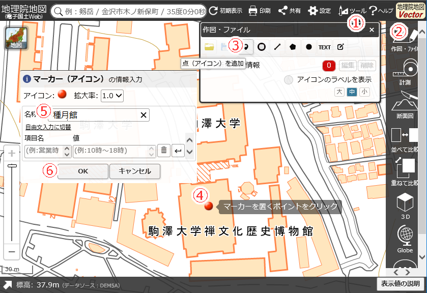 | 「地理院地図」を開いて、お目当ての場所を拡大したら... ①上のメニューから「ツール」を選び ②右のメニューから「作図・ファイル」を選びます。 すると別窓が開くので、③左から三番目のアイコンをクリックすると、マークが表示されます。 ④マウスでマークしたい場所に移動して、クリックすると別窓が開き⑤名称をつけることができます。 よかったら⑥OKしてください。なお、下の画像にはありませんが⑦「確定」ボタンで場所を確定してください。 これで場所のマークが終了です。ちなみに、いくつでもできます。マークも色々選べます。 |