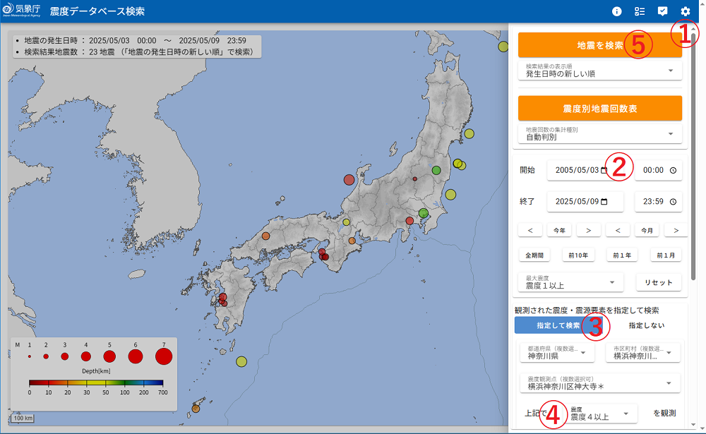 ①右上の「歯車ボタン」でメニューが表示されます。②検索開始日を入力しましょう(例えば誕生日)。 ③震度観測点の場所を指定しましょう。この例では、「神奈川県横浜市神奈川区神大寺(かんだいじ)」で設定しました。 ④検索する震度について、「震度4以上」くらいがいいでしょう。震度を小さくすると検索例が多くなってしまいますので。 ⑤設定が終わったら右上のオレンジボタン「地震を検索」をクリックしてください。 |