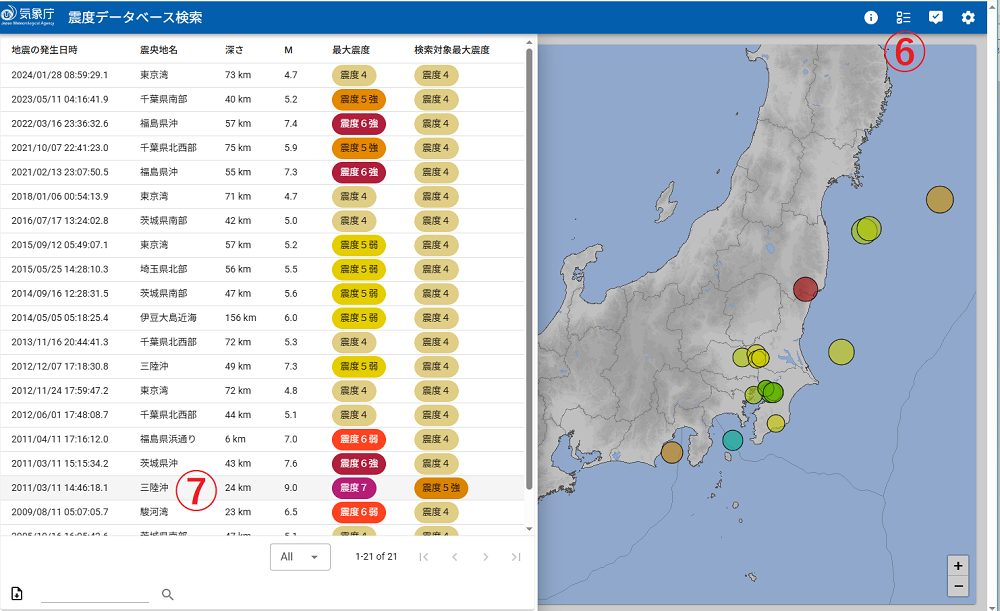 検索結果が地図表示されます。 2005年5月3日以降で、神奈川区神大寺(かんだいじ)では、震度4以上が、21例ありました。 ⑥右上の「リスト書きボタン」で検索された21例がリスト表示されます。 2011年3月11日に発生した三陸沖を震源とする地震(東日本大震災)の震度5強が最も強い揺れだったようです。 マグニチュードは9.0でした。最大震度としては、震度7のところがあったようです。 |
