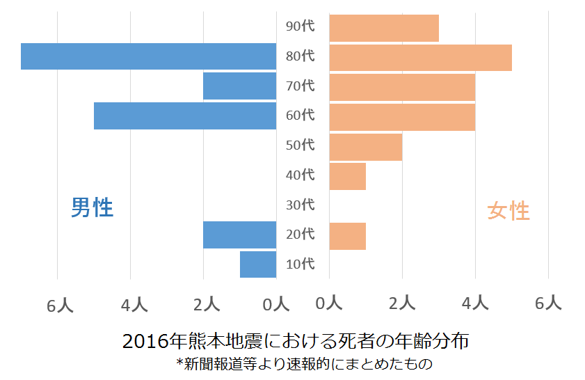 死者の年齢分布をグラフ化したものです。新聞報道等を参考にしています。男女の別は名前から判断しています。これを作成した2016年4月18日段階で、年齢がわかった死者は37人でした。4月14日夜の前震での死者は9人、4月16日未明の本震による死者は28人でした。上図の37人のうち、65歳以上は27人(73%)です。なお、4月18日時点で、身元不明の死者、行方不明の死者、連絡が取れない方などがいましたが、それらはグラフに含めていません。 *最終的に、地震による直接的な死者は50人、関連死は212人におよびました。(2019年4月修正) *静岡大牛山素行先生による集計では、直接死50人のうち65歳以上が34人(68%)とのことです. 関連死は、車中泊後に亡くなったり、被害を受けた病院からの移送中・移送後に亡くなったりした方です。 関連死が直接死の4倍以上になっています。 地震の人的被害を軽減するために、どうすればよいのでしょうか? (人的被害エクセルファイル) |