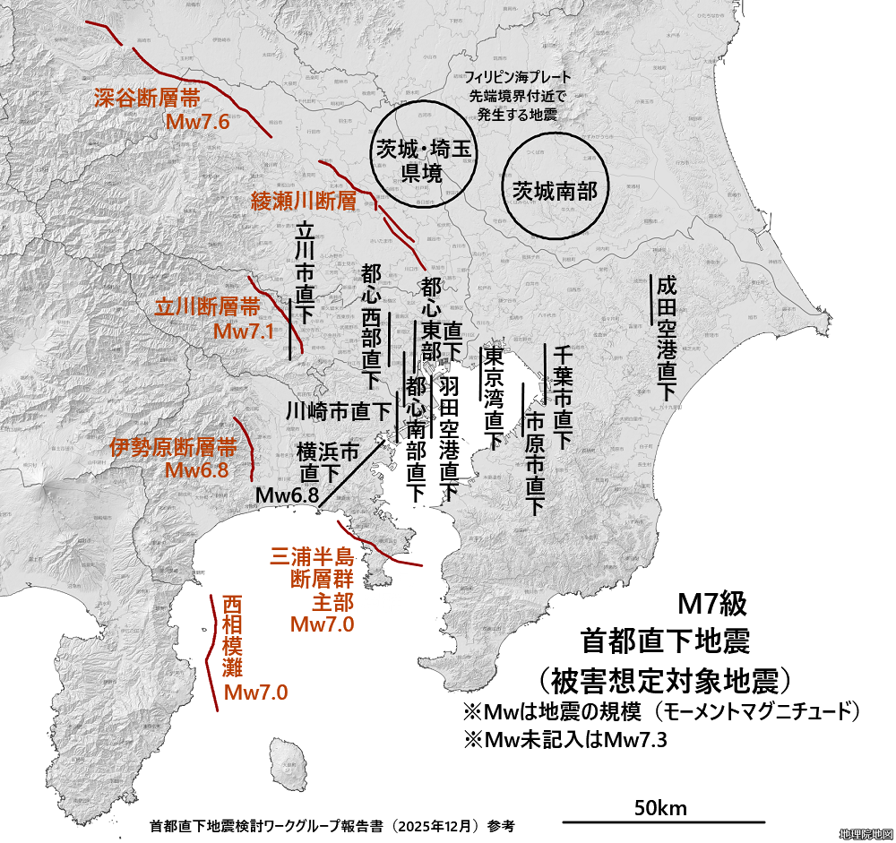 | 2011年の東北太平洋沖地震(東日本大震災)以降、想定地震についての見直しが進みました。 東京湾周辺は、厚い堆積物に覆われ、どこに断層があるのか、よくわからない状況ですが、 仮に未知の断層が動いてMw7.3の地震を引き起こした場合は、どの程度の揺れと被害が想定されるか、 首都直下地震対策検討ワーキンググループで検討され、報告書(2025年12月)が公表されました。 上図は地理院地図上にトレース作図したものです。Mwは地震の規模(モーメントマグニチュード) 既知の断層(6地震)は茶色で表現しました。未知の断層(11地震)は黒の縦線で表現しました。 「茨城・埼玉県境地震」「茨城南部地震」は、フィリピン海プレートの先端で起きるとみられる地震です。 いつ、どの断層がズレるかわかりませんし、地震規模がどの程度かも起こってみないとわかりません。 なので、震源や地震の規模を仮定した上で被害を検討したわけです。