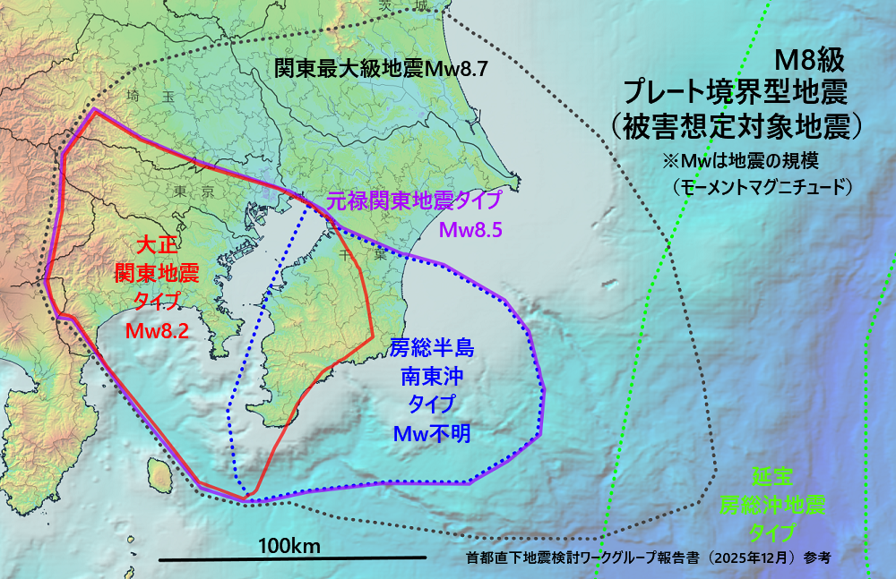 M8級の地震は、プレート境界付近で岩盤破壊が発生します。M8はM7よりも地震のエネルギーが32倍も大きいです。 M7級の直下型と比較すると、激しい揺れが広域におよぶとみられます。 「大正関東地震」は、1923年9月1日に発生した地震で、東京・横浜は大きな被害を受けました。 死者・行方不明者は10万5千人に達しました。火災による焼死者が多かった地震です。 この大正関東地震が中期的な防災・減災対策の想定地震となっています。 なお、津波については、「大正関東地震」と「延宝房総沖地震」が中期的な防災・減災対策の対象となります。 「延宝房総沖地震」は地震の揺れによる被害の記録がなく、津波被害の記録が残る地震です。 |