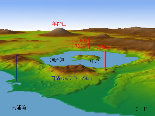 | 北海道の代表的な観光地である洞爺湖もカルデラです。 カルデラ底は湖に、中央火口丘は「中島」という島になっています。 大規模な噴火は11万年前と考えられ、 この時の噴出物は北海道や東北北部にみられます。 火山の生成はカルデラの中央部以外でも起こります。 洞爺カルデラの南の外輪に位置する有珠山は現在も活動中です。 2000年3月31日の噴火により洞爺湖温泉街に被害がでました。 この地図の作成にあたっては、国土地理院長の承認を得て、 同院発行の数値地図50mメッシュ(標高)を使用したものです。 (承認番号 平17総使、第341号) 国土地理院「ウオッちず」 洞爺湖カルデラ(地理院地図) 洞爺湖(グーグルアース) |