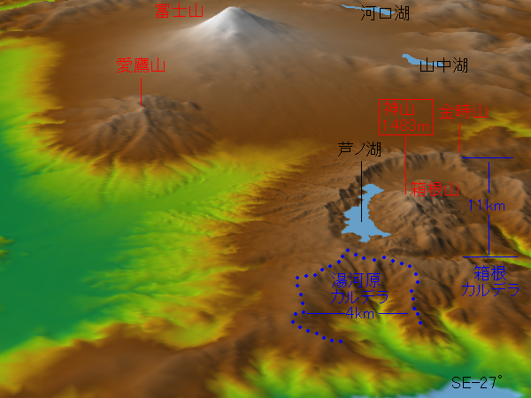| 都心から最も近いカルデラ地形は箱根にあります。 ドライブするには程よい距離です。 直径は阿蘇カルデラの半分程度ですが、外輪山が観光道路になっています。 箱根火山は約50万年前から活動をはじめて古い火山です。 金時山を含む古期外輪山は、 推定標高2800mの円錐火山の名残であるとの説があります。 つまり富士山のような均整の取れた火山がかつては箱根にあり、 大規模な噴火により山体が吹き飛ん でカルデラが形成されたと考えられています。 このようなカルデラを「爆発カルデラ」と呼んだりします。 また、古期外輪山はいくつかの成層火山の集合体で、 個々の火山の数回の噴火によって、 複数のカルデラが連接して形成されたという別の説もあります。 カルデラ底に水がたまってできたのが観光船が運航されてる「芦ノ湖」です。 実は箱根の外輪山は2重になっていて、芦ノ湖の内側にある山々は、 16万年前からの火山活動により作られました(新期外輪山)。 こちらでも大規模な噴火により、 約6万6千年前に大量の軽石を放出しました。 武蔵野台地に降り積もりましたし、 火砕流は現在の横浜市の一部まで達したようです。 手前にある湯河原カルデラは、はるか昔にあった湯河原火山の火口が 長年の侵食によって作られた「侵食カルデラ」であると考えられています。 この地図の作成にあたっては、国土地理院長の承認を得て、 同院発行の数値地図50mメッシュ(標高)を使用したものです。 (承認番号 平17総使、第341号) 箱根(地理院地図) 箱根山(グーグルアース) |