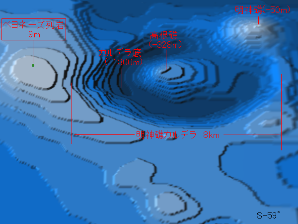 | 海洋地形調査の専門家はこのような図を「鯨瞰図」というそうです。 海にもカルデラ地形があることがわかっています。 八丈島のはるか南の海上に"ベヨネーズ"と呼ばれる数十個の岩があります。 名前は、1846年に発見したフランスの軍艦の名前に由来しているそうです。 海底地形の測量により、カルデラ底は海面下1300mで、 中央火口丘にあたる高根礁が海面下328mであることがわかりました。 ベヨネーズ列岩は、外輪山の一部で、それが海上に顔を出していることになります。 1952年9月17日に明神礁で噴煙や小島の形成を伴う火山活動が確認されています。 この地図の作成にあたっては、 海上保安庁海洋情報部作成の海域火山データベース 「海の基本図(海底地形図)」を参考にしました。 明神礁カルデラ(海上保安庁) ベヨネーズ列岩(グーグルアース) |