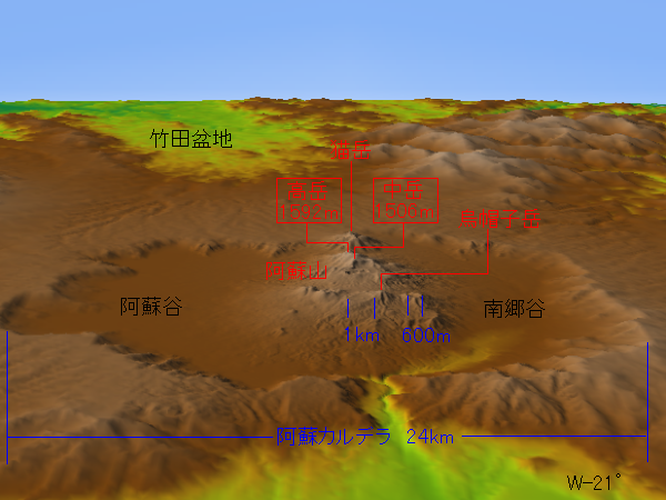 | 南北24kmにも及ぶ広大なカルデラを持つ阿蘇山です。 カルデラ底にあたる「阿蘇谷」や「南郷谷」は人間の生活の場になっています。 「カルデラ」とはポルトガル語で「鍋」の意味だそうで、うまいネーミングだと思います。 鍋底の中央部で再び火山活動が始まり、高岳など中央火口丘が作られました。 阿蘇カルデラは30万年前から9万年前にかけて、4回の大噴火で形成されたとみられます。 特に4回目の噴火による火砕流は、九州の北半分を焼き尽くすほど大規模でした。 この時の火山灰は、遠く離れた北海道でも10センチ位降り積もっています。 阿蘇第4火砕流の噴出量は、雲仙普賢岳火砕流の100万倍に及ぶと見積もられています。 大量の火山噴出物が放出された結果、地下が空洞となり、 重力によって陥没してできたのが、阿蘇カルデラです(陥没カルデラ)。 この地図の作成にあたっては、国土地理院長の承認を得て、 同院発行の数値地図50mメッシュ(標高)を使用したものです。 (承認番号 平17総使、第341号) 阿蘇カルデラ(地理院地図) 阿蘇山(グーグルアース) |