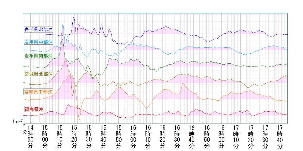 | 元データは港湾研究所による。外洋では最初の極大波が最も高かったようです。 なお、最初の極大波が最大となるとは限りません。特に海岸部では複雑な地形の影響を受けることにもよります。 茨城県大洗港では、地震から2時間後(16時50分頃)の4回目の極大波が最大となりました。 青森県むつ市関根浜では、地震発生から3時間20分後(18時15分頃)に最大波となりました。 外洋の津波の様子youtube(海上保安庁) |