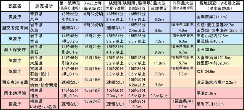 | (左のグラフ) 気象庁発表による津波の高さ(岩手県宮古、大船渡、宮城県石巻市鮎川、福島県相馬)。いずれも途中でデータが失われているのは、津波による験潮施設に被害が生じたり、電源喪失によりデータが受信できなかったことによる。 (下の表) 各地の津波の高さについてまとめたもの。気象庁が速報した津波の第一波の情報は、数十センチであり、防災情報としてはほとんど意味をなしていない。TVで情報見て、「たいしたことない」と判断し逃げなかった人もいるのではないかと言われている。津波高が3mを超えた時刻から最大にいたるまでの時間は3〜7分と短い。 |