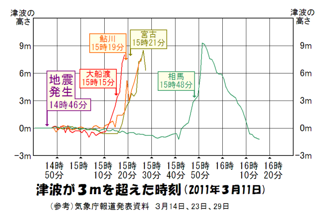 津波の高さが3mを上回るまでの時間は、岩手県大船渡26分、宮城県石巻市鮎川で30分、