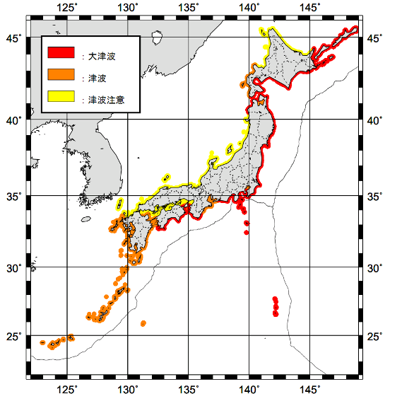 | 気象庁が発表した津波警報・注意報(上図は12日3時20分段階のもの) 下表は、気象庁が発表した「予想される津波の高さ」です。 時間とともに、高い値に修正されていったことがわかります。