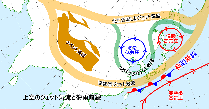 日本付近に停滞する梅雨前線は、上空の風の流れと密接な関係があります。