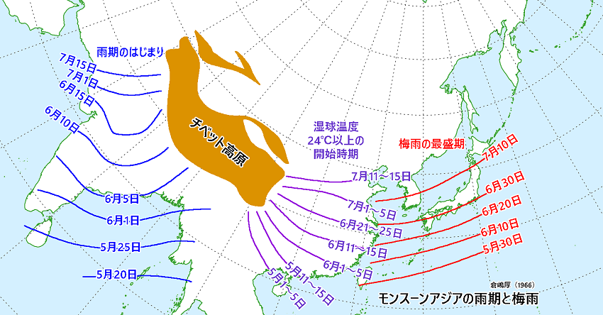 さて、元気象解説者の倉嶋厚さんが、50年以上も前にアジアの雨期について1枚の図にまとめました。