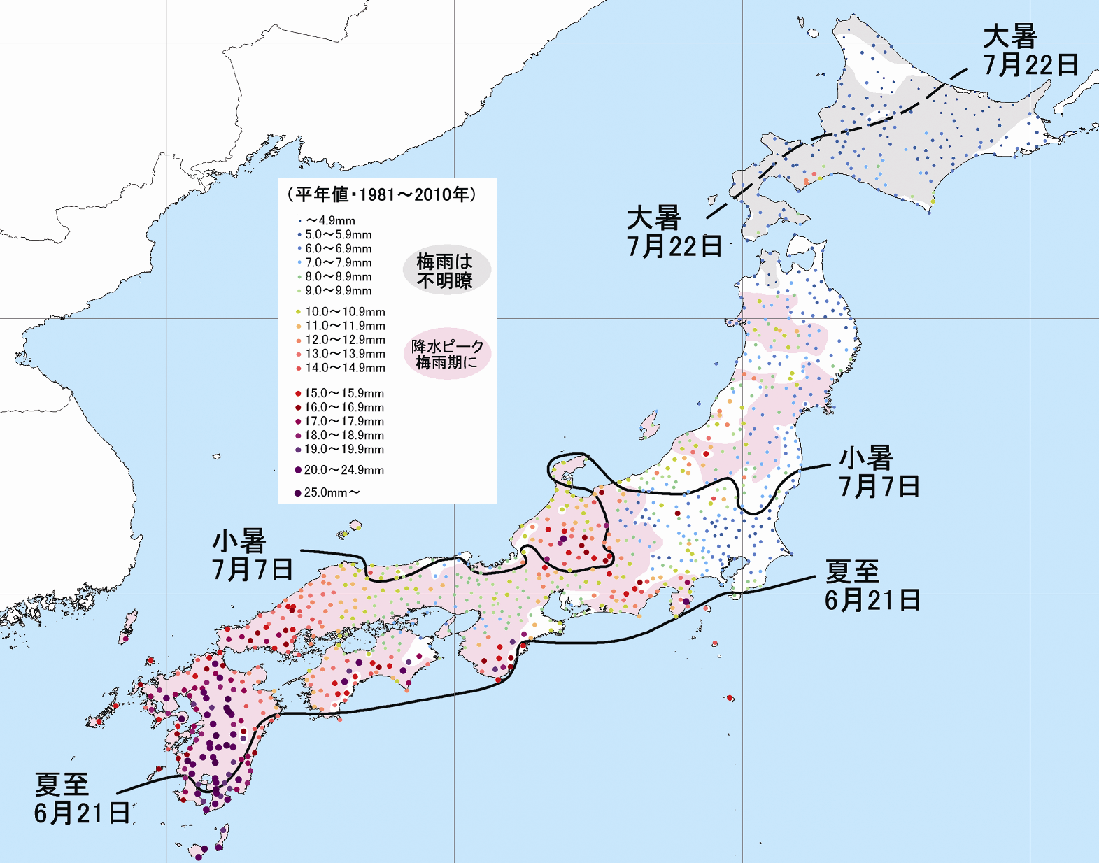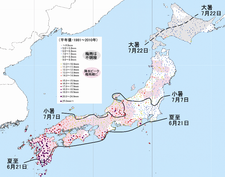 過去30年の平均データ(平年値・日雨量)でもその違いははっきり現れます。