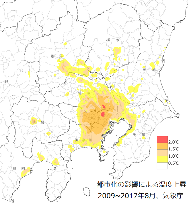 気象庁が、都市化による温度上昇を算出したものです。 2009年から2017年にかけての9年間について、 まずは、コンピューターで8月の毎日の気温を 実際の観測値に合うように再現しました。 つぎに、地表面状態や排熱量を都市化する前の状態に 設定して再計算しました。 二つの結果を比較することで、 温度上昇のうち都市化の部分を地図化したものです。 都市化の影響が最も強く出ているのは、 中野区・練馬区・戸田市・さいたま市あたりです。 横浜など東京湾岸は、海の気候緩和作用の恩恵もあって、 温度上昇はいくぶん抑えられているようにも見えます。 地図にマウスを重ねると人口集中地区(2015年国勢調査)が表示されます。 大局的にみれば、人口の集中している地域で、 温度上昇が顕著となっているようです。 |
