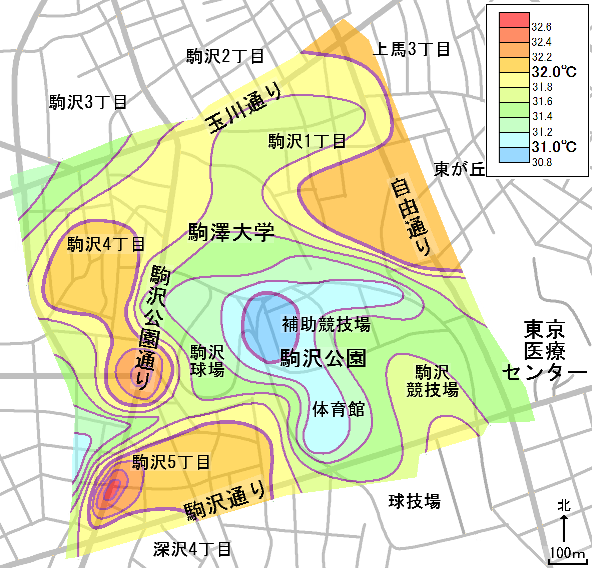 | 温度差は小さいものの、駒沢公園内が低温で周辺部が高温になっています。 土地利用との関係を考えてみよう。 野球場の近くの低温域は、2006年度以降の観測で、毎年確認されています。 地理院地図空中写真 |