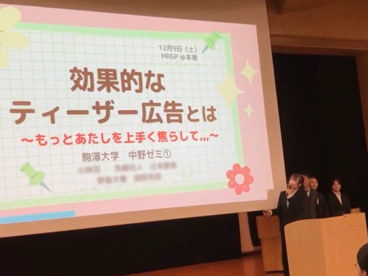 中野ゼミではMRGP「Marketing Research Grand Prix」という7、8大学合同の研究発表会に毎年2年生が参加します。各グループ5名に分かれて研究を行います。例年の参加大学は駒澤大学、中京大学、東洋大学、山形大学、名城大学、関西学院大学、千葉商科大学、近畿大学です。※年により若干の変更があります。大会の優勝チームは「日経広告研所報」に学生論文として掲載していただきます。